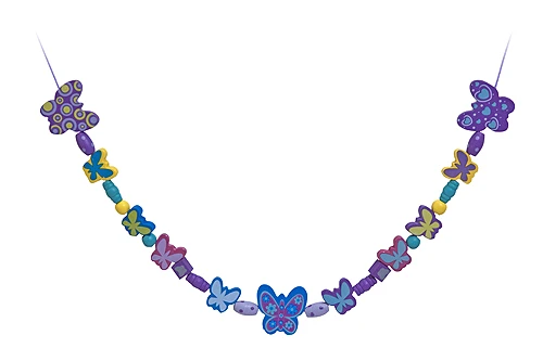 Holzbox mit verschiedenen Holzperlen zum Thema Schmetterlinge. Aus ca. 120 verschiedenen Perlen – Schmetterlinge und andere Formen – alle in aufeinander abgestimmten Farben können wunderschöne Ketten gefädelt werden.